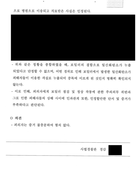 비록 이 사건 당시 숙박업소 보일러실 등에서 일산화탄소가 검출되기는 하였으나 해당 일산화탄소가 어떤 이유로 검출되었는지 확인되지 않는 점, 국과수 감식 결과 보일러 자체에는 문제가 없다는 결과가 나온 점,