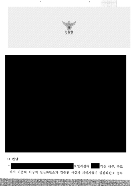 현장 감식 결과 숙박업소에 기준치 이상의 일산화탄소가 검출되었고,