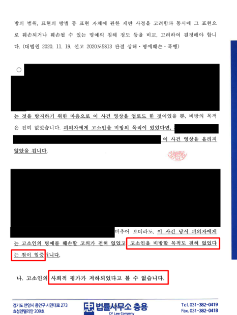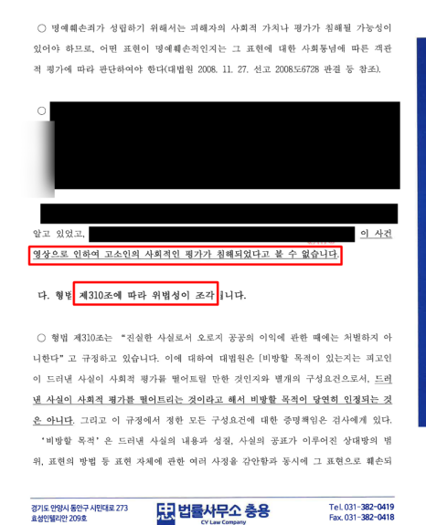 저희 법률사무소에 내방하여 주셨고, 자신은 명예훼손의 목적으로 해당 영상을 업로드 한 것이 아닌데, 명예훼손으로 처벌받으면 억울할 것 같다며 '무혐의' 처분을 받고 싶다고 말씀하셨습니다.
