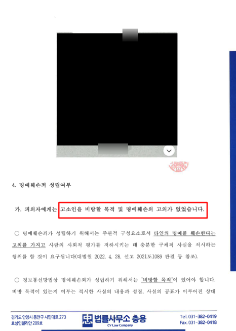 변호인의견서에는 의뢰인에게 명예훼손의 고의가 없다는 점에 포커스를 두고 작성하였습니다.