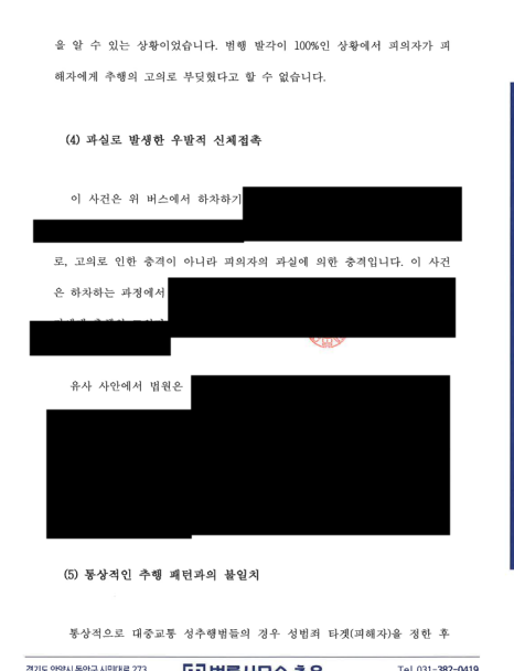 비록 버스 안에서 의뢰인과 피해자 사이의 신체 접촉은 있었지만 추행의 고의에 의한 것이 아니라는 점을 강조하였습니다.