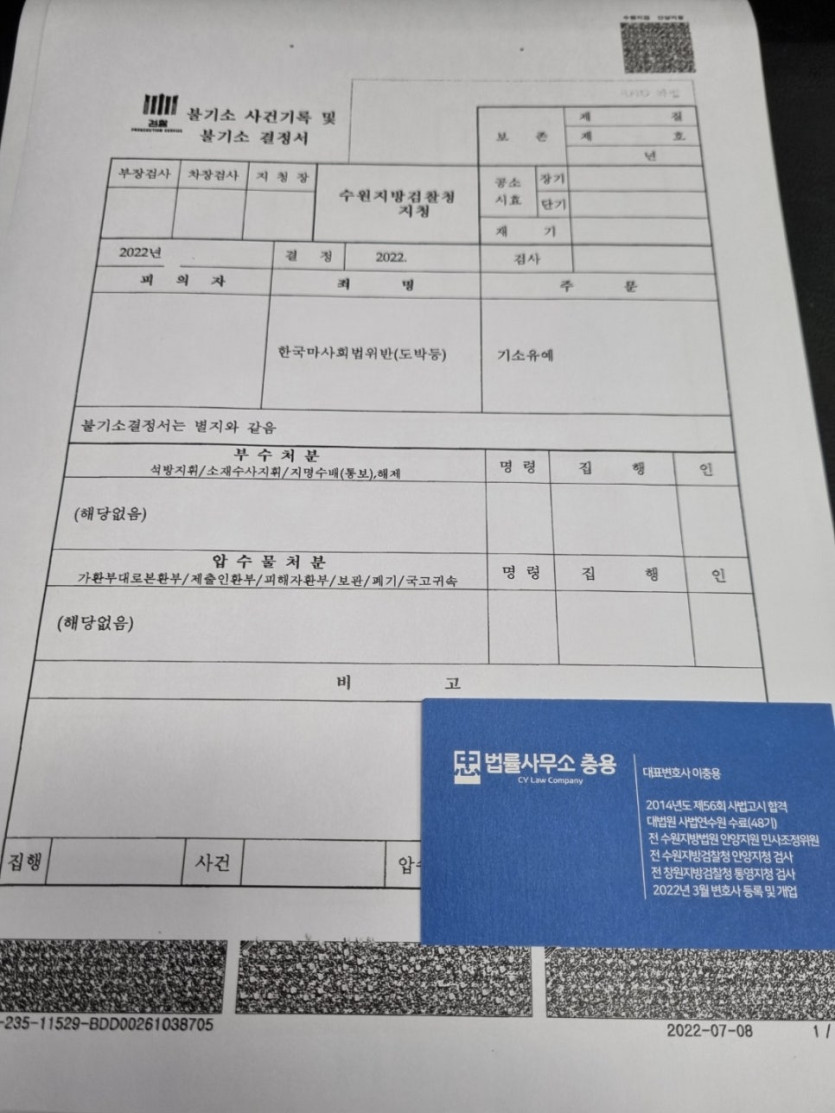 다만 의뢰인과 함께 경찰조사를 받으며 도박을 하게 된 경위, 도박으로 딴 돈을 다시 도박한 경우가 대부분이므로 실제 의뢰인이 도박에 사용한 원금은 생각보다 많지 않다는 점 등에 관하여 피의자신문조서가 잘 작성되도록 조력을 하였고, 경찰조사 이후 의뢰인이 가지고 있는 특유의 양형자료(동종전과 없는 점, 의뢰인 신분 등)와 도박죄에 있어 일반적으로 어필할 수 있는 양형자료를 논리정연하게 구성하여 의뢰인에게 기소유예 처분이 내려져야 한다는 취지의 변호인의견서를 제출하였습니다.