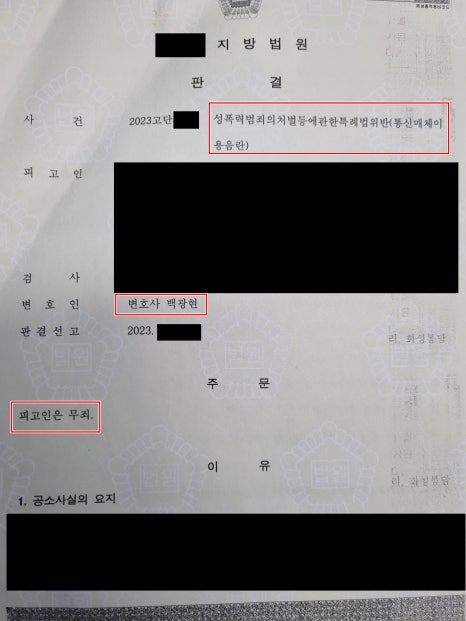의뢰인께서는 성범죄 전과는 각오하고 있었고 벌금형의 선처를 기대하고 저희 사무실에 오셨는데, 저희는 통매음 무죄 선고를 받아주며 마무리 되었습니다.