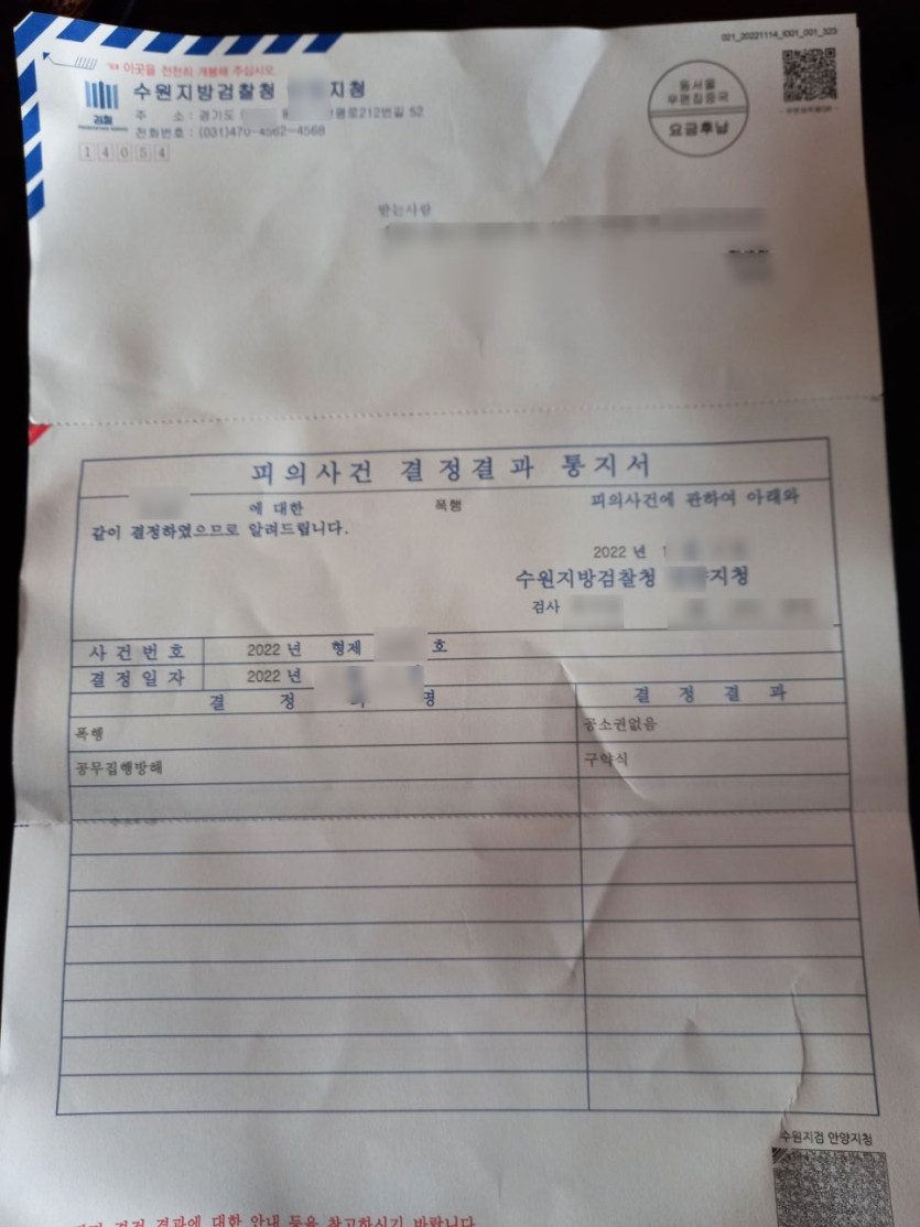 결과는 폭행죄 불기소처분(공소권없음), 공무집행방해 벌금형 약식 처분이 나왔습니다.