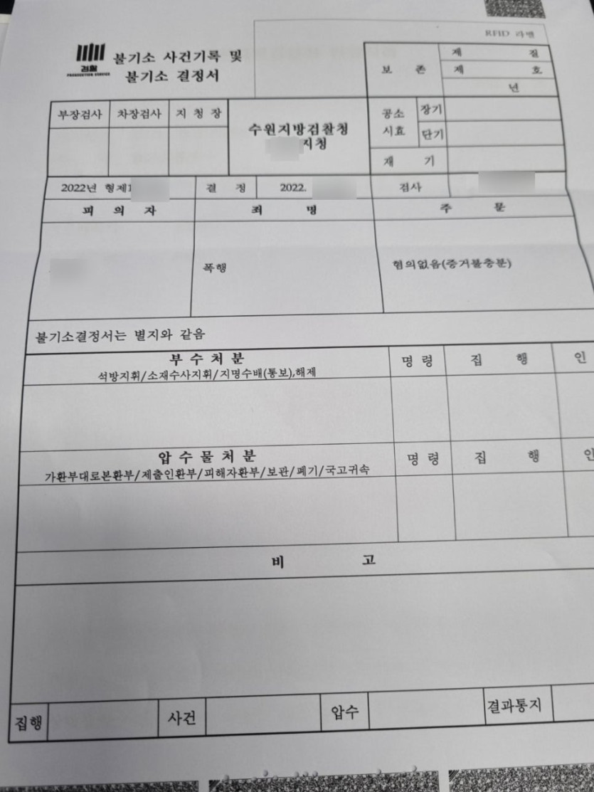 사건 결과는 제 예상과 마찬가지로 검찰 무혐의(혐의없음 불기소) 처분이 나왔습니다.