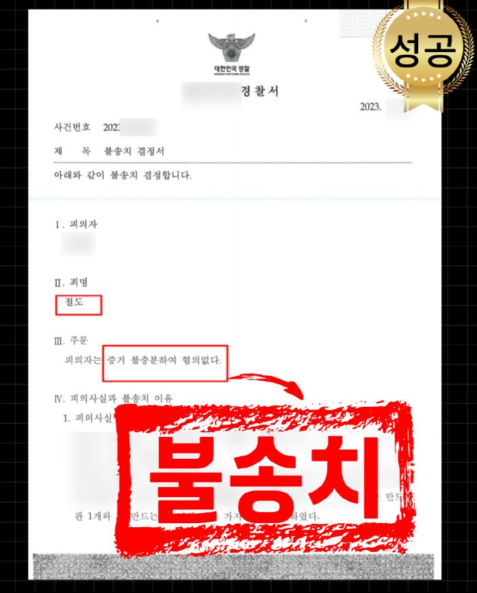 담당 경찰관은 제 의견서 내용을 모두 받아들여 의뢰인의 절도 혐의에 대하여 혐의없음 불송치 처분을 하였습니다.