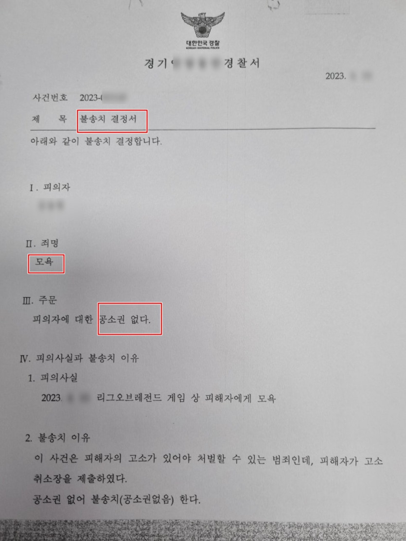 모욕죄 - 경찰 불송치(공소권없음) 성공 사례