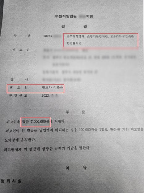 보통 공무집행방해 벌금 이 500만 원 정도인 것을 감안하면, 벌금 700만 원은 공무집행방해 벌금 수준이 상당히 높은 편에 속합니다.