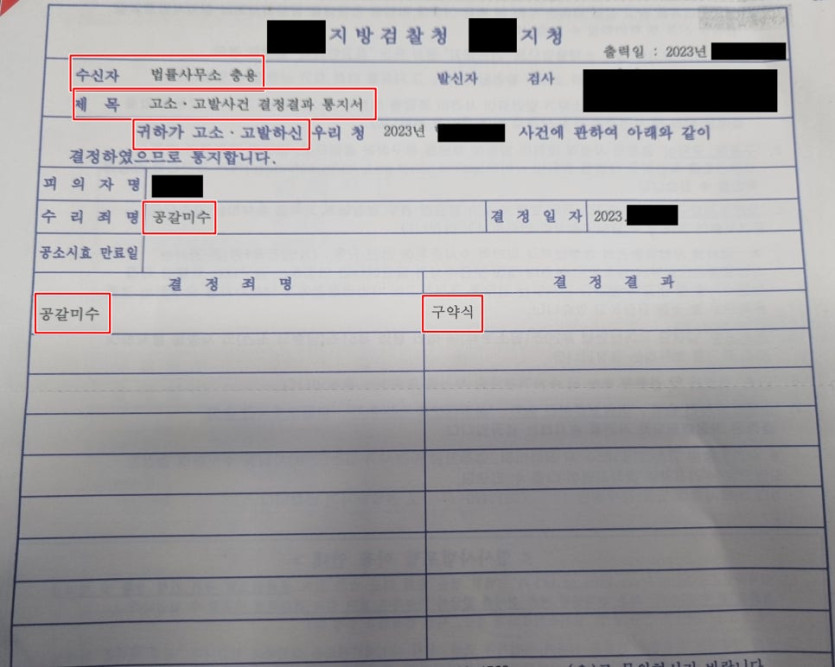 의뢰인에게 합의의사를 물어보았으나, 금액에 상관없이 합의는 없다는 의견을 받아 합의는 결렬되었고, 결국 검찰에서는 상대방에 대한 공갈미수 혐의를 인정하여 구약식 벌금형 처분을 하였습니다.