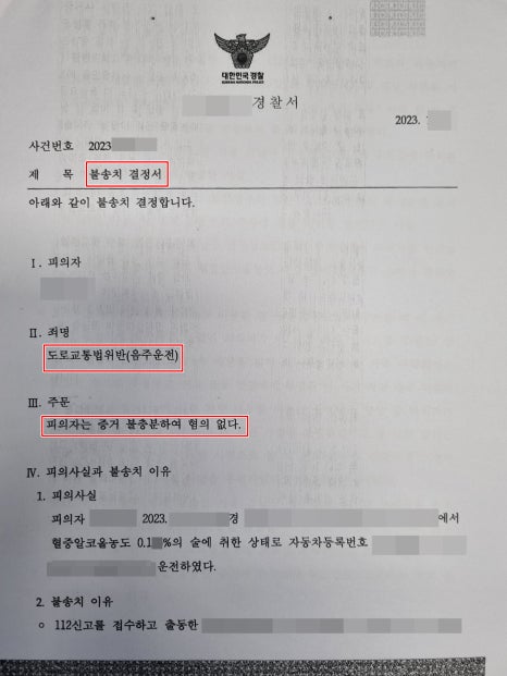이 사건 음주운전 담당 경찰관은 피의자신문조사 당시 음주운전 혐의가 있다고 보셨으나, 음주운전 전문변호사인 제 변호사의견서 제출 후 결국 입장을 바꾸어 무혐의 '불송치' 처분을 내리셨습니다.
