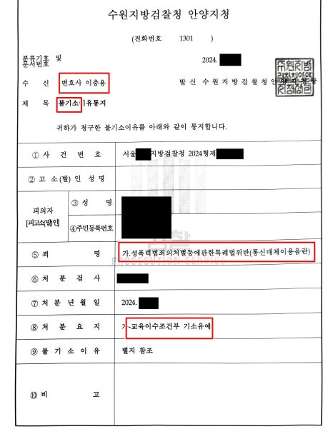 담당 검사님께서는 변호인의견서를 전부 받아들이고, 이 사건 통매음, 즉 통신매체이용음란 사건에 대하여 기소유예 불기소처분을 하셨습니다.