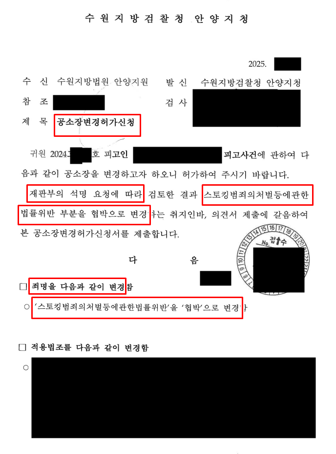 이 사건을 스토킹처벌법 상 스토킹행위에 해당한다고 기소한 검찰은 스토킹처벌법위반 사건이 무죄가 나올 수 있다고 판단하여 재판부의 석명 요청에 따라 죄명을 스토킹처벌법위반죄가 아닌 협박죄로 공소장을 변경하였습니다.