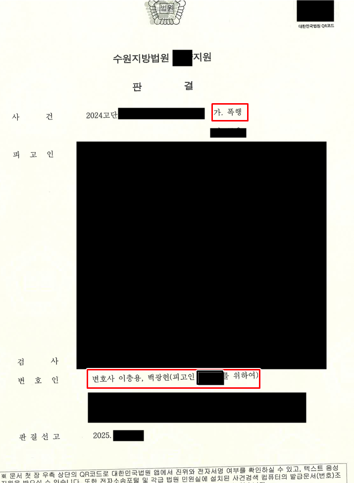 적극적인 변론 결과, 법원은 의뢰인에게 폭행죄가 성립한다는 경찰, 검찰의 판단을 뒤집고 제 의견을 받아들이며 의뢰인에게 폭행죄 무죄 판결을 선고하였습니다.