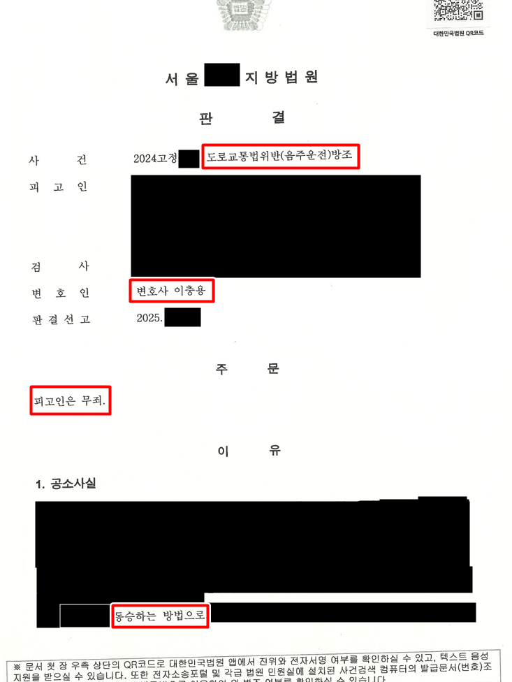변호인인 제 의견을 전부 받아들이며 의뢰인에게 음주운전방조 무죄 판결을 선고하였습니다.