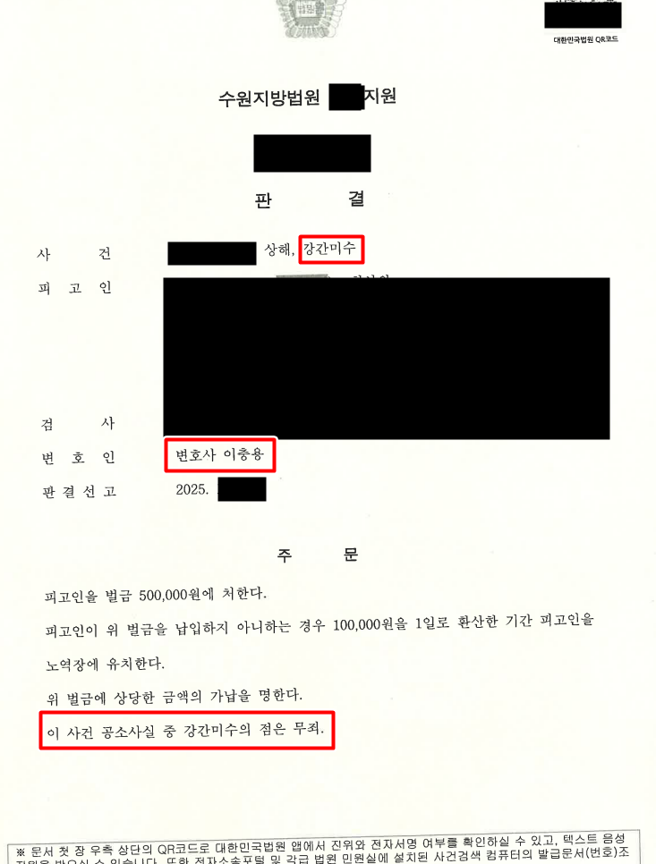 의뢰인은 자백했던 상해죄에 대하여 벌금 50만 원을 선고받았을 뿐,