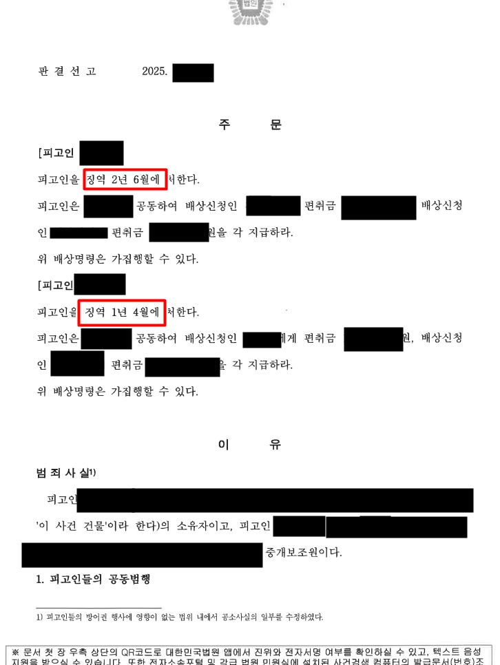 사기죄의 공동정범으로 구성한 집주인과 공인중개보조원은 각각 징역형을 선고받고 그 자리에서 법정구속되었습니다.