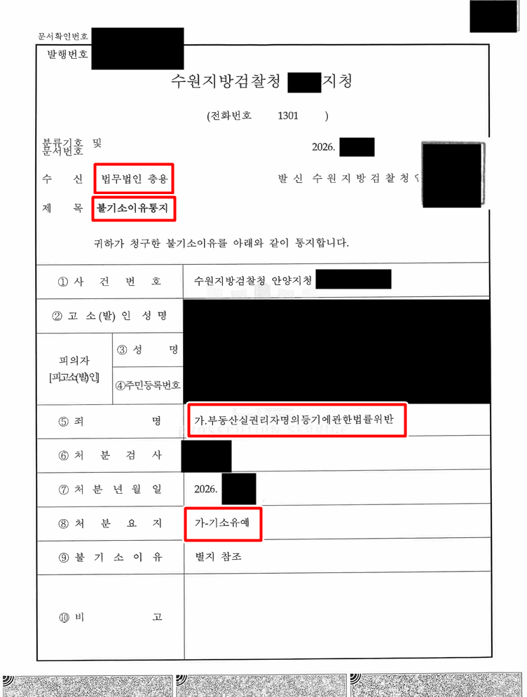 적극적인 변론 결과, 검사님께서는 제 의견을 모두 받아들이시고 이 사건 명의신탁을 원인으로 한 부동산실명법위반 사건에 대하여 불기소(기소유예) 처분을 내리셨습니다.